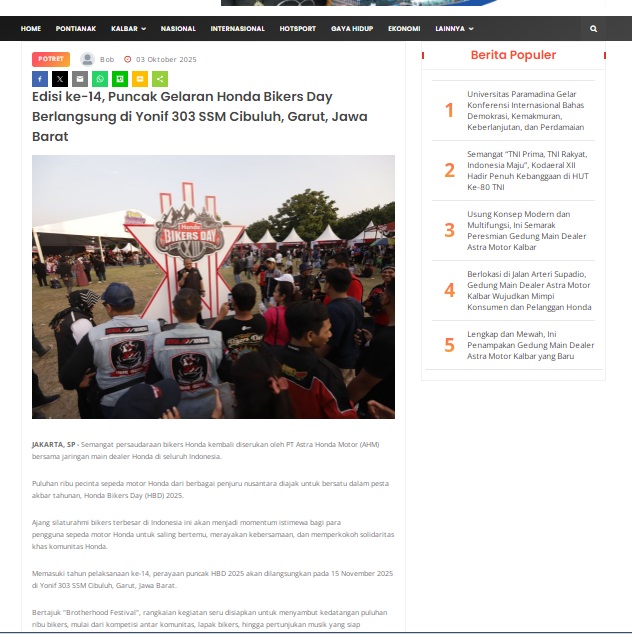 Edisi ke-14, Puncak Gelaran Honda Bikers Day Berlangsung di Yonif 303 SSM Cibuluh, Garut, Jawa Barat by masmul 3 Oktober 2025 in Silahkan kunjungi https://www.suarapemredkalbar.com/read/potret/03102025/edisi-ke-14-puncak-gelaran-honda-bikers-day-berlangsung-di-yonif-303-ssm-cibuluh-garut-jawa-barat. You Might Like Regional Public Launching New ADV160 The SUV Pride Grand Launching New PCX 160 Truly Exceptional! Tetap hati-hati ya bro sist berkendara saat hujan.