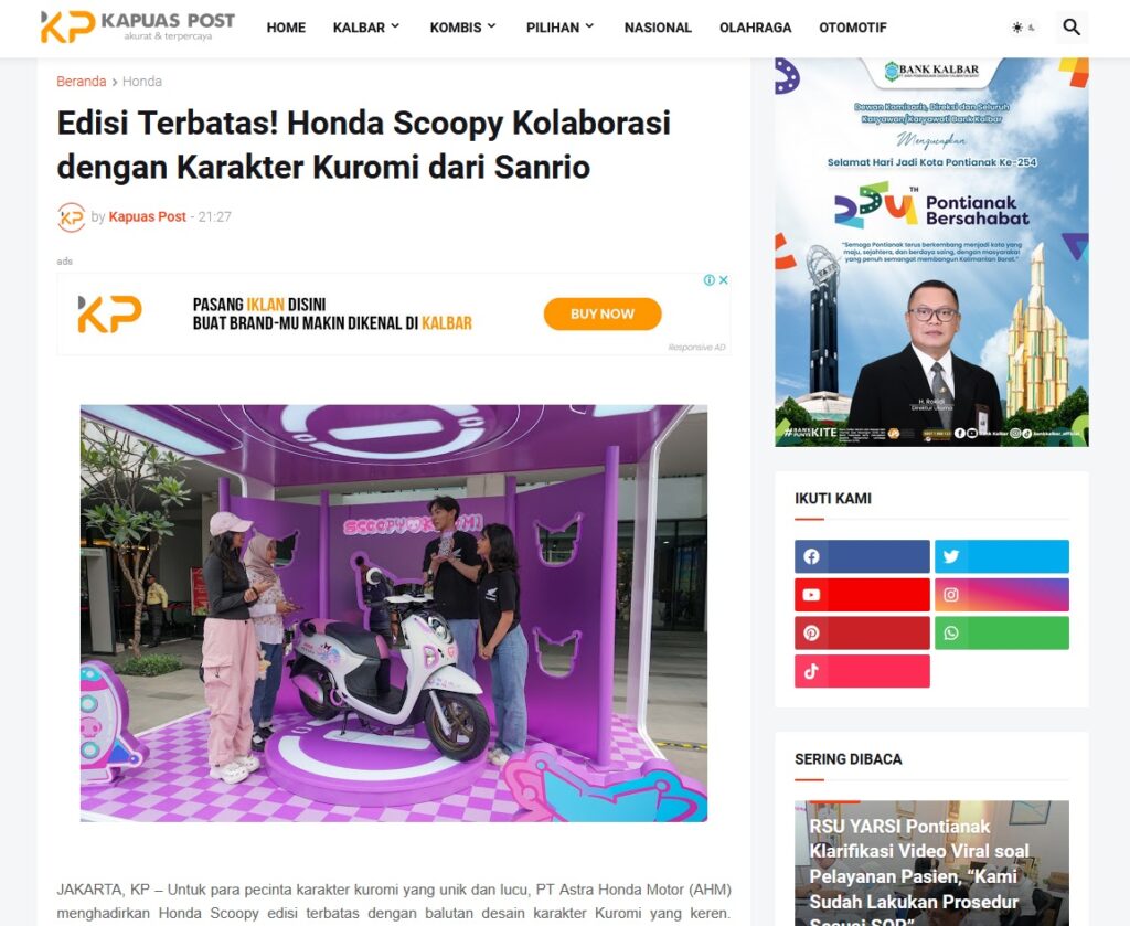 Edisi Terbatas! Honda Scoopy Kolaborasi dengan Karakter Kuromi dari Sanrio by Muhammad Arif 21 Oktober 2025 in Silahkan kunjungi https://www.kapuaspost.web.id/2025/10/edisi-terbatas-honda-scoopy-kolaborasi.html. Tags: astra Astra Motor kalbar Astra Motor Pontianak astramotor honda kalbar pontianak sepeda motor You Might Like Regional Public Launching New ADV160 The SUV Pride Grand Launching New PCX 160 Truly Exceptional! Tetap hati-hati ya bro sist berkendara saat hujan.