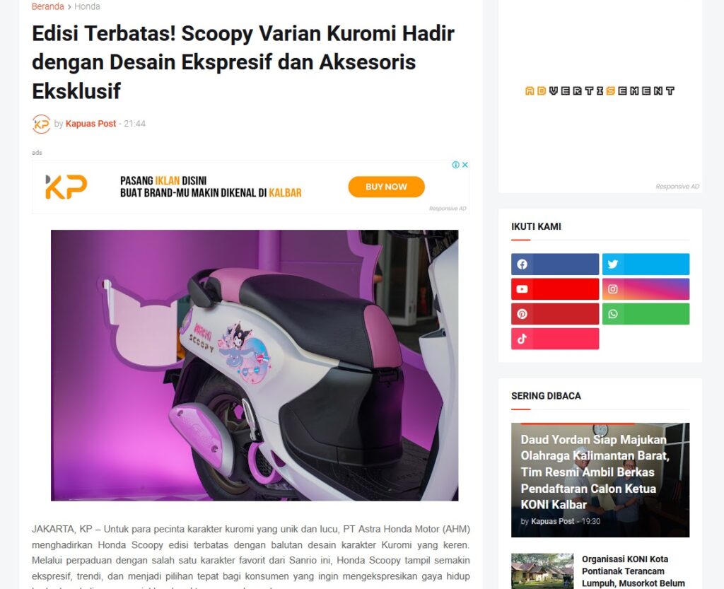 Edisi Terbatas! Scoopy Varian Kuromi Hadir dengan Desain Ekspresif dan Aksesoris Eksklusif by Muhammad Arif 18 November 2025 in Silahkan kunjungi https://www.kapuaspost.web.id/2025/11/edisi-terbatas-scoopy-varian-kuromi.html. Tags: astra Astra Motor kalbar Astra Motor Pontianak astramotor honda kalbar pontianak sepeda motor You Might Like Regional Public Launching New ADV160 The SUV Pride Grand Launching New PCX 160 Truly Exceptional! Tetap hati-hati ya bro sist berkendara saat hujan.