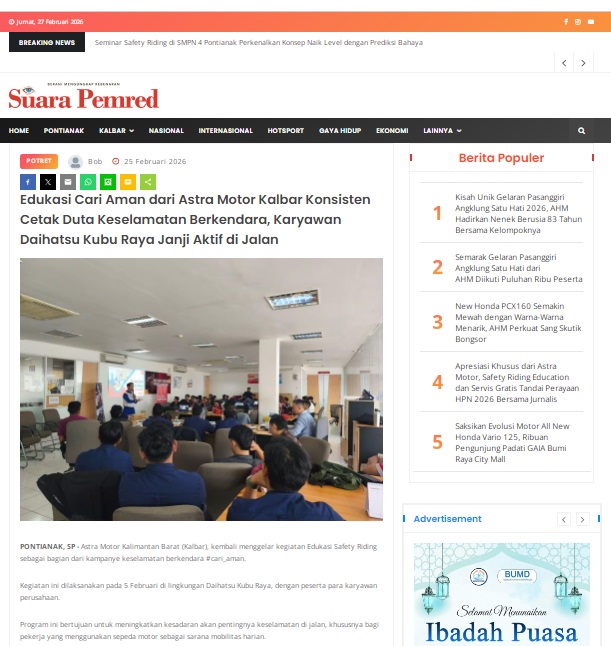 Edukasi Cari Aman dari Astra Motor Kalbar Konsisten Cetak Duta Keselamatan Berkendara, Karyawan Daihatsu Kubu Raya Janji Aktif di Jalan by masmul 25 Februari 2026 in Silahkan kunjungi https://www.suarapemredkalbar.com/read/potret/25022026/edukasi-cari-aman-dari-astra-motor-kalbar-konsisten-cetak-duta-keselamatan-berkendara-karyawan-daihatsu-kubu-raya-janji-aktif-di-jalan. You Might Like Regional Public Launching New ADV160 The SUV Pride Grand Launching New PCX 160 Truly Exceptional! Tetap hati-hati ya bro sist berkendara saat hujan.