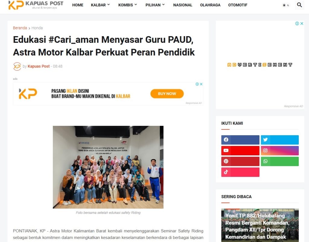 Edukasi #Cari_aman Menyasar Guru PAUD, Astra Motor Kalbar Perkuat Peran Pendidik by Muhammad Arif 27 Januari 2026 in Silahkan kunjungi https://www.kapuaspost.web.id/2026/01/Edukasi-Cariaman-Menyasar-Guru-PAUD.html. Tags: astra Astra Motor kalbar Astra Motor Pontianak astramotor honda kalbar pontianak sepeda motor You Might Like Regional Public Launching New ADV160 The SUV Pride Grand Launching New PCX 160 Truly Exceptional! Tetap hati-hati ya bro sist berkendara saat hujan.