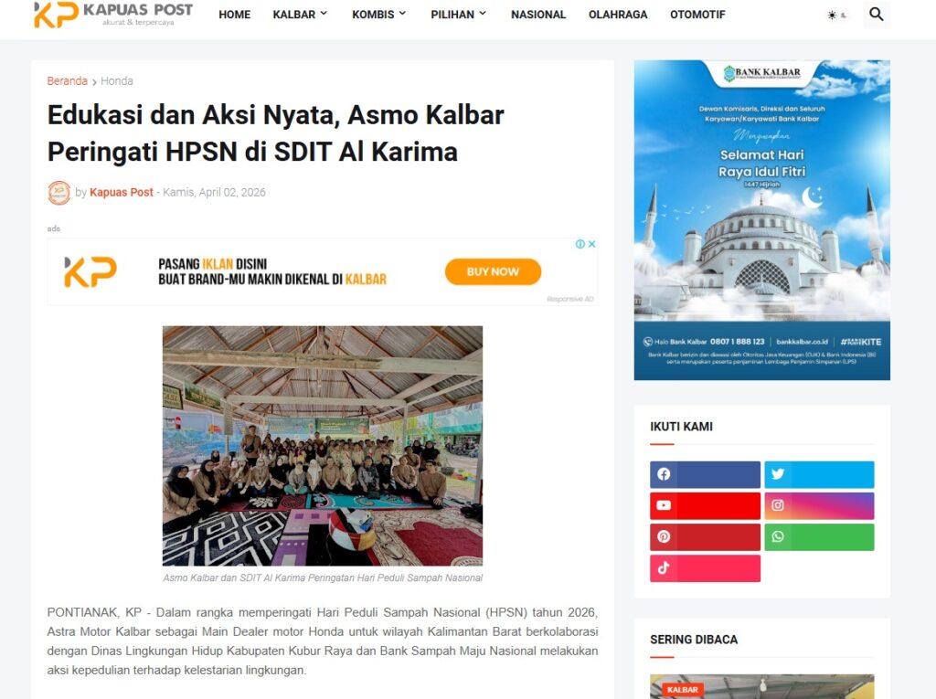 Edukasi dan Aksi Nyata, Asmo Kalbar Peringati HPSN di SDIT Al Karima by Muhammad Arif 2 April 2026 in Silahkan kunjungi https://www.kapuaspost.web.id/2026/04/edukasi-dan-aksi-nyata-asmo-kalbar.html. Tags: astra Astra Motor kalbar Astra Motor Pontianak astramotor honda kalbar pontianak sepeda motor You Might Like Regional Public Launching New ADV160 The SUV Pride Grand Launching New PCX 160 Truly Exceptional! Tetap hati-hati ya bro sist berkendara saat hujan.