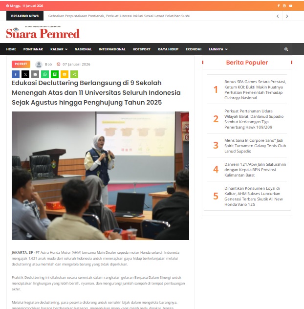 Edukasi Decluttering Berlangsung di 9 Sekolah Menengah Atas dan 11 Universitas Seluruh Indonesia Sejak Agustus hingga Penghujung Tahun 2025 by masmul 7 Januari 2026 in Silahkan kunjungi https://www.suarapemredkalbar.com/read/potret/07012026/edukasi-decluttering-berlangsung-di-9-sekolah-menengah-atas-dan-11-universitas-seluruh-indonesia-sejak-agustus-hingga-penghujung-tahun-2025. You Might Like Regional Public Launching New ADV160 The SUV Pride Grand Launching New PCX 160 Truly Exceptional! Tetap hati-hati ya bro sist berkendara saat hujan.
