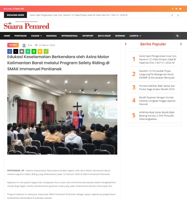 Edukasi Keselamatan Berkendara oleh Astra Motor Kalimantan Barat melalui Program Safety Riding di SMAK Immanuel Pontianak by masmul 22 Maret 2026 in Silahkan kunjungi https://www.suarapemredkalbar.com/read/potret/22032026/edukasi-keselamatan-berkendara-oleh-astra-motor-kalimantan-barat-melalui-program-safety-riding-di-smak-immanuel-pontianak. You Might Like Regional Public Launching New ADV160 The SUV Pride Grand Launching New PCX 160 Truly Exceptional! Tetap hati-hati ya bro sist berkendara saat hujan.