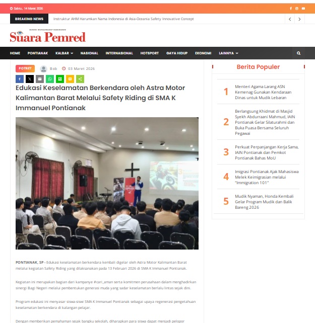Edukasi Keselamatan Berkendara oleh Astra Motor Kalimantan Barat Melalui Safety Riding di SMA K Immanuel Pontianak by masmul 3 Maret 2026 in Silahkan kunjungi https://www.suarapemredkalbar.com/read/potret/03032026/edukasi-keselamatan-berkendara-oleh-astra-motor-kalimantan-barat-melalui-safety-riding-di-sma-k-immanuel-pontianak. You Might Like Regional Public Launching New ADV160 The SUV Pride Grand Launching New PCX 160 Truly Exceptional! Tetap hati-hati ya bro sist berkendara saat hujan.
