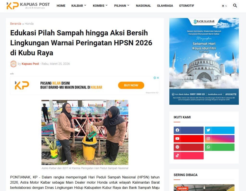 Edukasi Pilah Sampah hingga Aksi Bersih Lingkungan Warnai Peringatan HPSN 2026 di Kubu Raya by Muhammad Arif 25 Maret 2026 in Silahkan kunjungi https://www.kapuaspost.web.id/2026/03/edukasi-pilah-sampah-hingga-aksi-bersih.html. Tags: astra Astra Motor kalbar Astra Motor Pontianak astramotor honda kalbar pontianak sepeda motor You Might Like Regional Public Launching New ADV160 The SUV Pride Grand Launching New PCX 160 Truly Exceptional! Tetap hati-hati ya bro sist berkendara saat hujan.