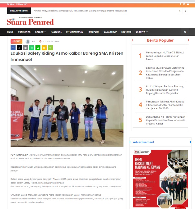 Edukasi Safety Riding Asmo Kalbar Bareng SMA Kristen Immanuel by masmul 21 Maret 2025 in Silahkan kunjungi https://www.suarapemredkalbar.com/read/potret/21032025/edukasi-safety-riding-asmo-kalbar-bareng-sma-kristen-immanuel. You Might Like Regional Public Launching New ADV160 The SUV Pride Grand Launching New PCX 160 Truly Exceptional! Tetap hati-hati ya bro sist berkendara saat hujan.