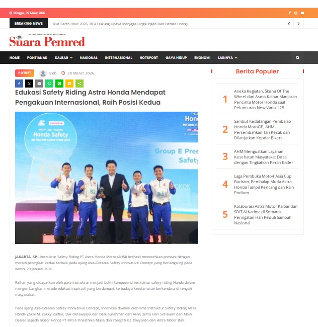 Edukasi Safety Riding Astra Honda Mendapat Pengakuan Internasional, Raih Posisi Kedua by masmul 28 Maret 2026 in Silahkan kunjungi https://www.suarapemredkalbar.com/read/potret/28032026/edukasi-safety-riding-astra-honda-mendapat-pengakuan-internasional-raih-posisi-kedua. You Might Like Regional Public Launching New ADV160 The SUV Pride Grand Launching New PCX 160 Truly Exceptional! Tetap hati-hati ya bro sist berkendara saat hujan.
