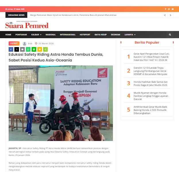Edukasi Safety Riding Astra Honda Tembus Dunia, Sabet Posisi Kedua Asia-Oceania by masmul 25 Maret 2026 in Silahkan kunjungi https://www.suarapemredkalbar.com/read/potret/25032026/edukasi-safety-riding-astra-honda-tembus-dunia-sabet-posisi-kedua-asia-oceania. You Might Like Regional Public Launching New ADV160 The SUV Pride Grand Launching New PCX 160 Truly Exceptional! Tetap hati-hati ya bro sist berkendara saat hujan.