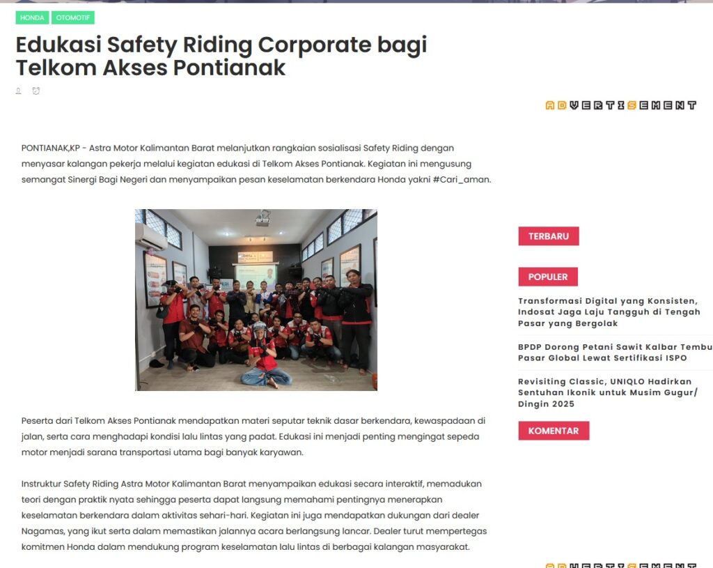 Edukasi Safety Riding Corporate bagi Telkom Akses Pontianak by Muhammad Arif 22 Agustus 2025 in Silahkan kunjungi https://www.kapuaspost.web.id/2025/08/edukasi-safety-riding-corporate-bagi.html. Tags: astra Astra Motor kalbar Astra Motor Pontianak astramotor honda kalbar pontianak sepeda motor You Might Like Regional Public Launching New ADV160 The SUV Pride Grand Launching New PCX 160 Truly Exceptional! Tetap hati-hati ya bro sist berkendara saat hujan.