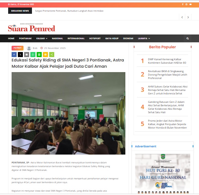 Edukasi Safety Riding di SMA Negeri 3 Pontianak, Astra Motor Kalbar Ajak Pelajar jadi Duta Cari Aman by masmul 25 November 2025 in Silahkan kunjungi https://www.suarapemredkalbar.com/read/potret/25112025/edukasi-safety-riding-di-sma-negeri-3-pontianak-astra-motor-kalbar-ajak-pelajar-jadi-duta-cari-aman. You Might Like Regional Public Launching New ADV160 The SUV Pride Grand Launching New PCX 160 Truly Exceptional! Tetap hati-hati ya bro sist berkendara saat hujan.