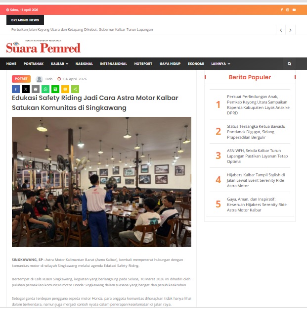 Edukasi Safety Riding Jadi Cara Astra Motor Kalbar Satukan Komunitas di Singkawang by masmul 4 April 2026 in Silahkan kunjungi https://www.suarapemredkalbar.com/read/potret/04042026/edukasi-safety-riding-jadi-cara-astra-motor-kalbar-satukan-komunitas-di-singkawang. You Might Like Regional Public Launching New ADV160 The SUV Pride Grand Launching New PCX 160 Truly Exceptional! Tetap hati-hati ya bro sist berkendara saat hujan.