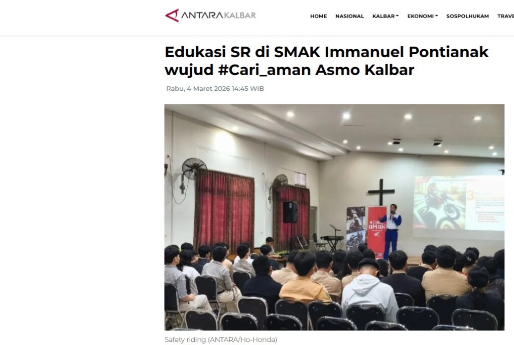 Edukasi SR di SMAK Immanuel Pontianak wujud #Cari_aman Asmo Kalbar by Sri Yuliantiningsih 4 Maret 2026 in Silahkan kunjungi https://kalbar.antaranews.com/berita/692459/edukasi-sr-di-smak-immanuel-pontianak-wujud-cari-aman-asmo-kalbar. You Might Like Regional Public Launching New ADV160 The SUV Pride Grand Launching New PCX 160 Truly Exceptional! Tetap hati-hati ya bro sist berkendara saat hujan.