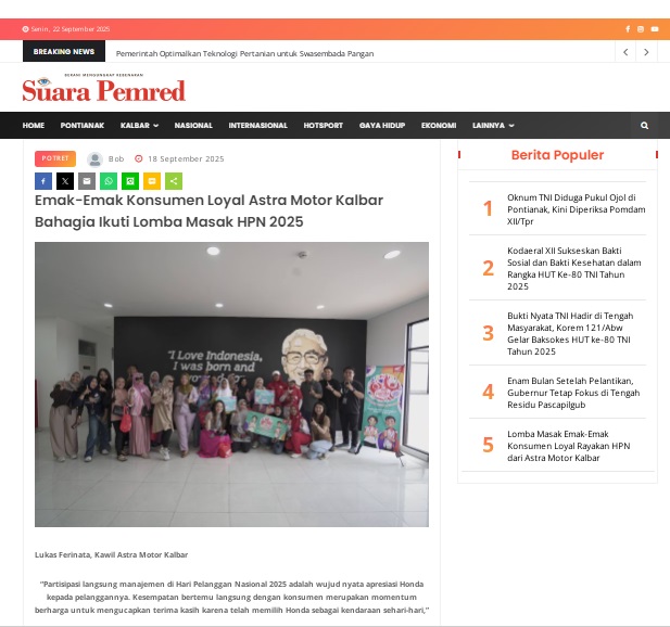 Emak-Emak Konsumen Loyal Astra Motor Kalbar Bahagia Ikuti Lomba Masak HPN 2025 by masmul 18 September 2025 in Silahkan kunjungi https://www.suarapemredkalbar.com/read/potret/18092025/emak-emak-konsumen-loyal-astra-motor-kalbar-bahagia-ikuti-lomba-masak-hpn-2025. You Might Like Regional Public Launching New ADV160 The SUV Pride Grand Launching New PCX 160 Truly Exceptional! Tetap hati-hati ya bro sist berkendara saat hujan.