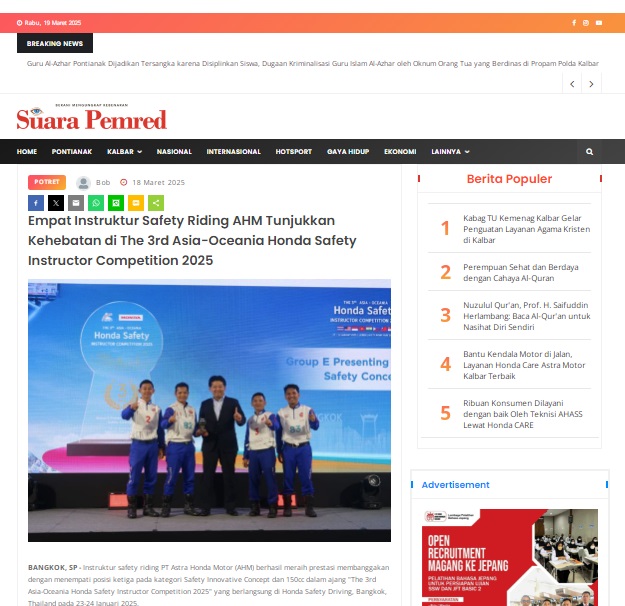Empat Instruktur Safety Riding AHM Tunjukkan Kehebatan di The 3rd Asia-Oceania Honda Safety Instructor Competition 2025 by masmul 18 Maret 2025 in Silahkan kunjungi https://www.suarapemredkalbar.com/read/potret/18032025/empat-instruktur-safety-riding-ahm-tunjukkan-kehebatan-di-the-3rd-asia-oceania-honda-safety-instructor-competition-2025. You Might Like Regional Public Launching New ADV160 The SUV Pride Grand Launching New PCX 160 Truly Exceptional! Tetap hati-hati ya bro sist berkendara saat hujan.