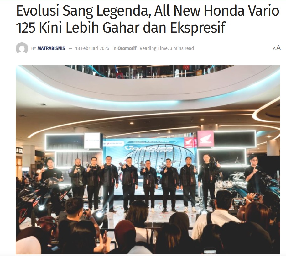 Evolusi Sang Legenda, All New Honda Vario 125 Kini Lebih Gahar dan Ekspresif by Sri Yuliantiningsih 18 Februari 2026 in Silahkan kunjungi https://matrabisnis.id/2026/02/18/evolusi-sang-legenda-all-new-honda-vario-125-kini-lebih-gahar-dan-ekspresif/#google_vignette. You Might Like Regional Public Launching New ADV160 The SUV Pride Grand Launching New PCX 160 Truly Exceptional! Tetap hati-hati ya bro sist berkendara saat hujan.