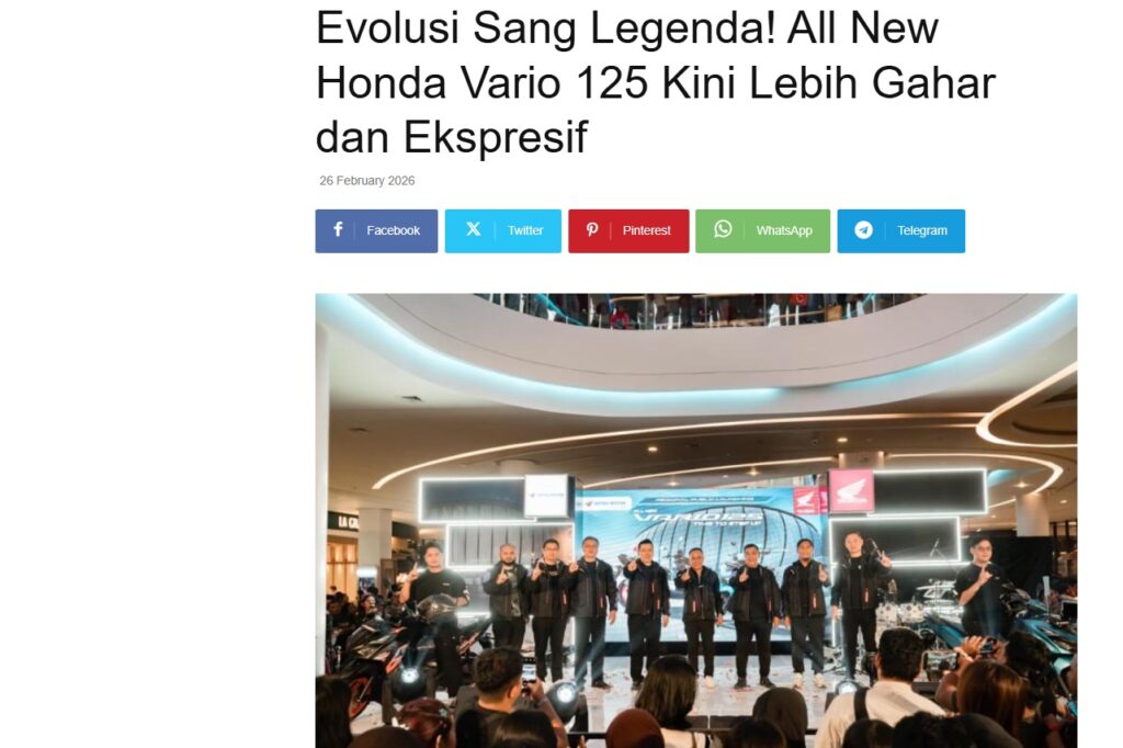 Evolusi Sang Legenda! All New Honda Vario 125 Kini Lebih Gahar dan Ekspresif by Nova Sari 26 Februari 2026 in Silahkan kunjungi https://equator.co.id/80917-2/. You Might Like Regional Public Launching New ADV160 The SUV Pride Grand Launching New PCX 160 Truly Exceptional! Tetap hati-hati ya bro sist berkendara saat hujan.