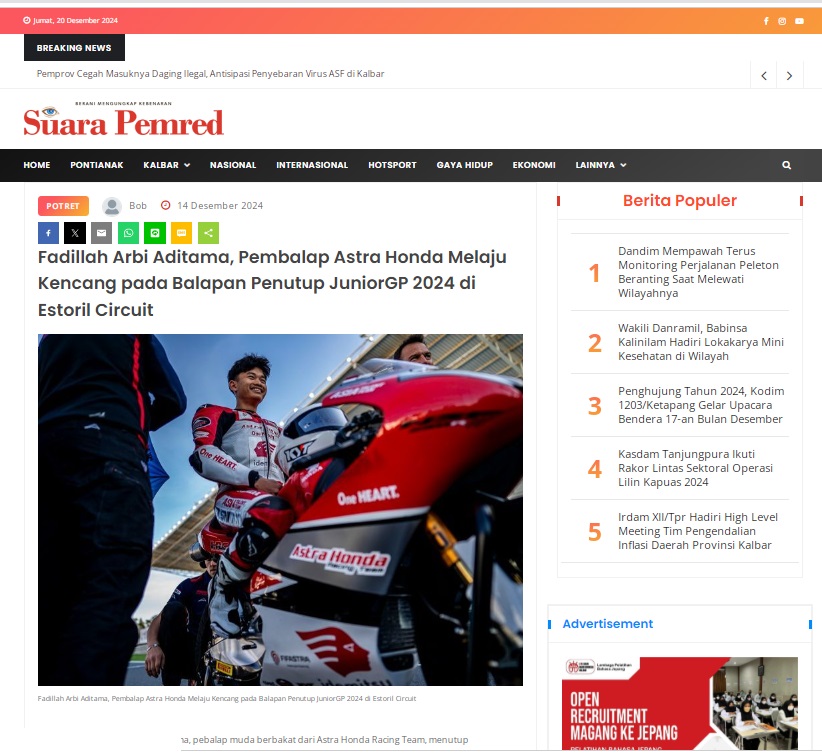 Fadillah Arbi Aditama, Pembalap Astra Honda Melaju Kencang pada Balapan Penutup JuniorGP 2024 di Estoril Circuit by masmul 14 Desember 2024 in Silahkan kunjungi https://www.suarapemredkalbar.com/read/potret/14122024/fadillah-arbi-aditama-pembalap-astra-honda-melaju-kencang-pada-balapan-penutup-juniorgp-2024-di-estoril-circuit. You Might Like Regional Public Launching New ADV160 The SUV Pride Grand Launching New PCX 160 Truly Exceptional! Tetap hati-hati ya bro sist berkendara saat hujan.