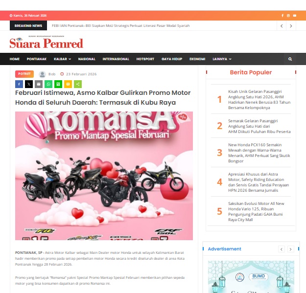Februari Istimewa, Asmo Kalbar Gulirkan Promo Motor Honda di Seluruh Daerah: Termasuk di Kubu Raya by masmul 23 Februari 2026 in Silahkan kunjungi https://www.suarapemredkalbar.com/read/potret/23022026/februari-istimewa-asmo-kalbar-gulirkan-promo-motor-honda-di-seluruh-daerah-termasuk-di-kubu-raya. You Might Like Regional Public Launching New ADV160 The SUV Pride Grand Launching New PCX 160 Truly Exceptional! Tetap hati-hati ya bro sist berkendara saat hujan.