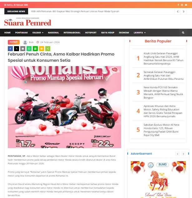 Februari Penuh Cinta, Asmo Kalbar Hadirkan Promo Spesial untuk Konsumen Setia by masmul 24 Februari 2026 in Silahkan kunjungi https://www.suarapemredkalbar.com/read/potret/24022026/februari-penuh-cinta-asmo-kalbar-hadirkan-promo-spesial-untuk-konsumen-setia. You Might Like Regional Public Launching New ADV160 The SUV Pride Grand Launching New PCX 160 Truly Exceptional! Tetap hati-hati ya bro sist berkendara saat hujan.