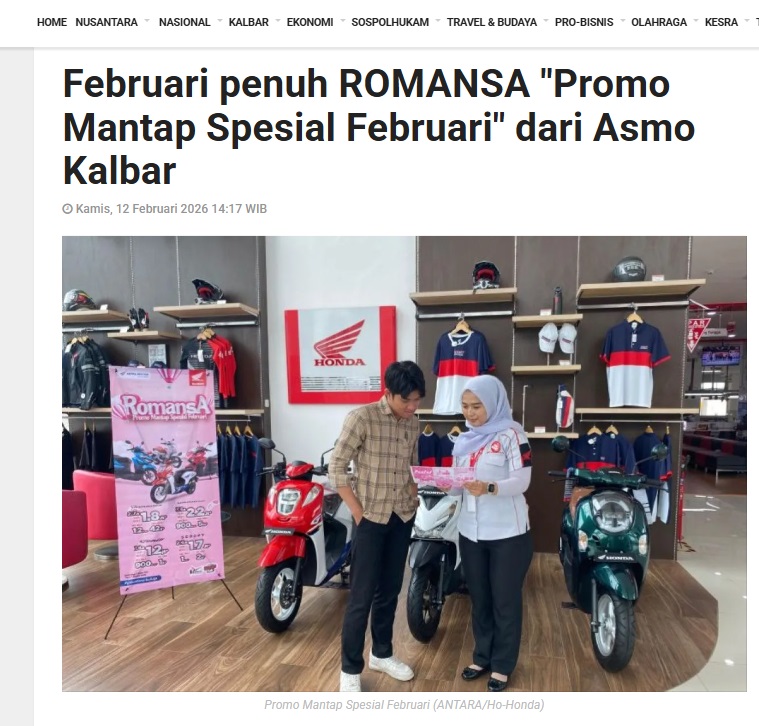 Februari penuh ROMANSA “Promo Mantap Spesial Februari” dari Asmo Kalbar by Dedi 12 Februari 2026 in Silahkan kunjungi https://kalbar.antaranews.com/berita/688586/februari-penuh-romansa-promo-mantap-spesial-februari-dari-asmo-kalbar. You Might Like Regional Public Launching New ADV160 The SUV Pride Grand Launching New PCX 160 Truly Exceptional! Tetap hati-hati ya bro sist berkendara saat hujan.