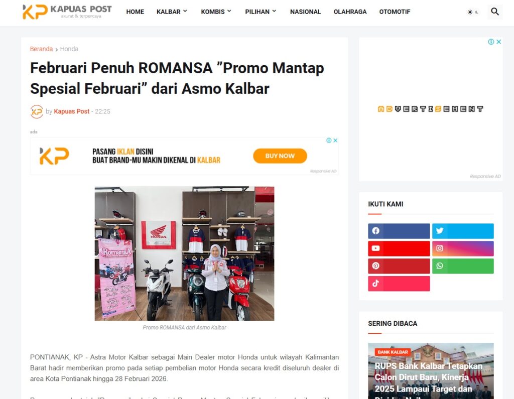 Februari Penuh ROMANSA ”Promo Mantap Spesial Februari” dari Asmo Kalbar by Muhammad Arif 11 Februari 2026 in Silahkan kunjungi https://www.kapuaspost.web.id/2026/02/februari-penuh-romansa-promo-mantap.html. Tags: astra Astra Motor kalbar Astra Motor Pontianak astramotor honda kalbar pontianak sepeda motor You Might Like Regional Public Launching New ADV160 The SUV Pride Grand Launching New PCX 160 Truly Exceptional! Tetap hati-hati ya bro sist berkendara saat hujan.