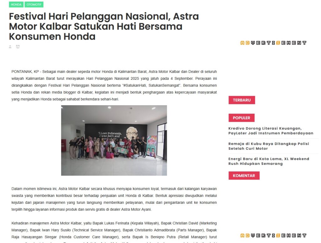 Festival Hari Pelanggan Nasional, Astra Motor Kalbar Satukan Hati Bersama Konsumen Honda by Muhammad Arif 16 September 2025 in Silahkan kunjungi https://www.kapuaspost.web.id/2025/09/festival-hari-pelanggan-nasional-astra.html. Tags: astra Astra Motor kalbar Astra Motor Pontianak astramotor honda kalbar pontianak sepeda motor You Might Like Regional Public Launching New ADV160 The SUV Pride Grand Launching New PCX 160 Truly Exceptional! Tetap hati-hati ya bro sist berkendara saat hujan.