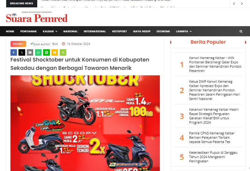 Festival Shocktober untuk Konsumen di Kabupaten Sekadau dengan Berbagai Tawaran Menarik by masmul 16 Oktober 2024 in Silahkan kunjungi https://www.suarapemredkalbar.com/read/potret/16102024/festival-shocktober-untuk-konsumen-di-kabupaten-sekadau-dengan-berbagai-tawaran-menarik. You Might Like Regional Public Launching New ADV160 The SUV Pride Grand Launching New PCX 160 Truly Exceptional! Tetap hati-hati ya bro sist berkendara saat hujan.