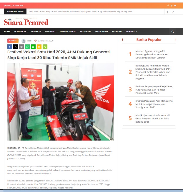 Festival Vokasi Satu Hati 2026, AHM Dukung Generasi Siap Kerja Usai 30 Ribu Talenta SMK Unjuk Skill by masmul 3 Maret 2026 in Silahkan kunjungi https://www.suarapemredkalbar.com/read/potret/03032026/festival-vokasi-satu-hati-2026-ahm-dukung-generasi-siap-kerja-usai-30-ribu-talenta-smk-unjuk-skill. You Might Like Regional Public Launching New ADV160 The SUV Pride Grand Launching New PCX 160 Truly Exceptional! Tetap hati-hati ya bro sist berkendara saat hujan.