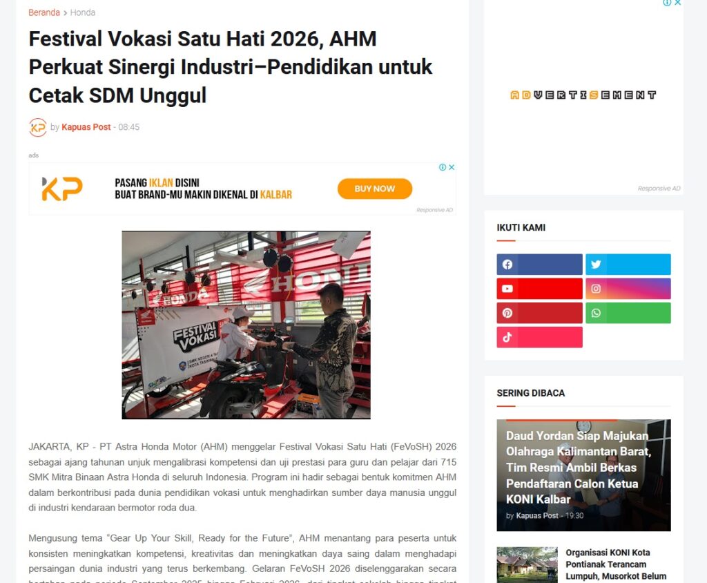 Festival Vokasi Satu Hati 2026, AHM Perkuat Sinergi Industri–Pendidikan untuk Cetak SDM Unggul by Muhammad Arif 8 Desember 2025 in Silahkan kunjungi https://www.kapuaspost.web.id/2025/12/festival-vokasi-satu-hati-2026-ahm.html. Tags: astra Astra Motor kalbar Astra Motor Pontianak astramotor honda kalbar pontianak sepeda motor You Might Like Regional Public Launching New ADV160 The SUV Pride Grand Launching New PCX 160 Truly Exceptional! Tetap hati-hati ya bro sist berkendara saat hujan.