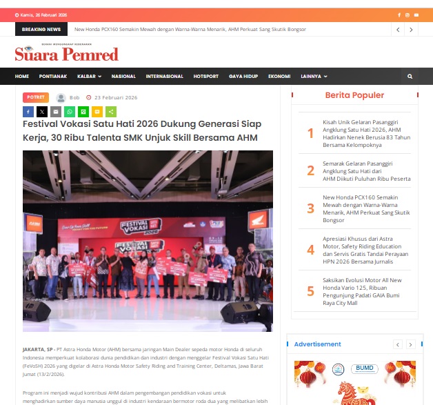 Festival Vokasi Satu Hati 2026 Dukung Generasi Siap Kerja, 30 Ribu Talenta SMK Unjuk Skill Bersama AHM by masmul 23 Februari 2026 in Silahkan kunjungi https://www.suarapemredkalbar.com/read/potret/23022026/festival-vokasi-satu-hati-2026-dukung-generasi-siap-kerja-30-ribu-talenta-smk-unjuk-skill-bersama-ahm. You Might Like Regional Public Launching New ADV160 The SUV Pride Grand Launching New PCX 160 Truly Exceptional! Tetap hati-hati ya bro sist berkendara saat hujan.