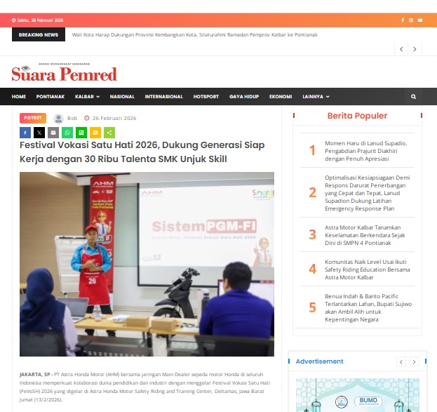 Festival Vokasi Satu Hati 2026, Dukung Generasi Siap Kerja dengan 30 Ribu Talenta SMK Unjuk Skill by masmul 26 Februari 2026 in Silahkan kunjungi https://www.suarapemredkalbar.com/read/potret/26022026/festival-vokasi-satu-hati-2026-dukung-generasi-siap-kerja-dengan-30-ribu-talenta-smk-unjuk-skill. You Might Like Regional Public Launching New ADV160 The SUV Pride Grand Launching New PCX 160 Truly Exceptional! Tetap hati-hati ya bro sist berkendara saat hujan.