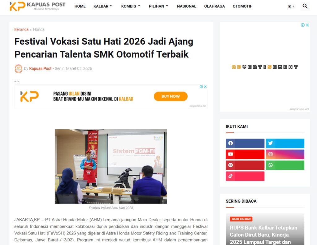 Festival Vokasi Satu Hati 2026 Jadi Ajang Pencarian Talenta SMK Otomotif Terbaik by Muhammad Arif 2 Maret 2026 in Silahkan kunjungi https://www.kapuaspost.web.id/2026/03/festival-vokasi-satu-hati-2026-jadi.html. Tags: astra Astra Motor kalbar Astra Motor Pontianak astramotor honda kalbar pontianak sepeda motor You Might Like Regional Public Launching New ADV160 The SUV Pride Grand Launching New PCX 160 Truly Exceptional! Tetap hati-hati ya bro sist berkendara saat hujan.