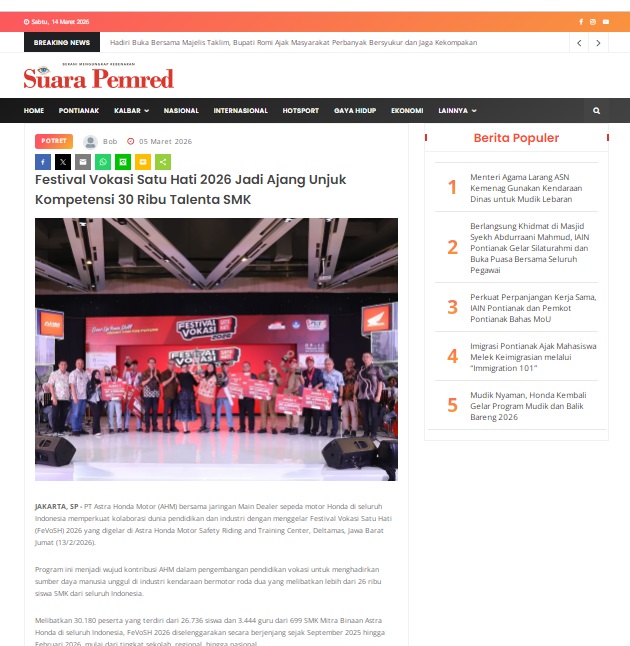 Festival Vokasi Satu Hati 2026 Jadi Ajang Unjuk Kompetensi 30 Ribu Talenta SMK by masmul 5 Maret 2026 in Silahkan kunjungi https://www.suarapemredkalbar.com/read/potret/05032026/festival-vokasi-satu-hati-2026-jadi-ajang-unjuk-kompetensi-30-ribu-talenta-smk. You Might Like Regional Public Launching New ADV160 The SUV Pride Grand Launching New PCX 160 Truly Exceptional! Tetap hati-hati ya bro sist berkendara saat hujan.