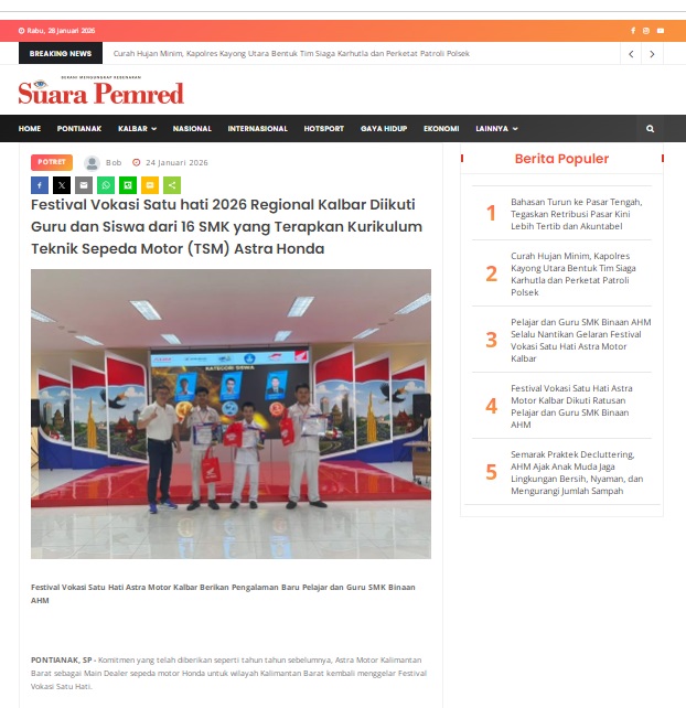Festival Vokasi Satu hati 2026 Regional Kalbar Diikuti Guru dan Siswa dari 16 SMK yang Terapkan Kurikulum Teknik Sepeda Motor (TSM) Astra Honda by masmul 24 Januari 2026 in Silahkan kunjungi https://www.suarapemredkalbar.com/read/potret/24012026/festival-vokasi-satu-hati-2026-regional-kalbar-diikuti-guru-dan-siswa-dari-16-smk-yang-terapkan-kurikulum-teknik-sepeda-motor-tsm-astra-honda. You Might Like Regional Public Launching New ADV160 The SUV Pride Grand Launching New PCX 160 Truly Exceptional! Tetap hati-hati ya bro sist berkendara saat hujan.