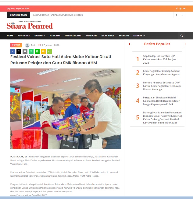 Festival Vokasi Satu Hati Astra Motor Kalbar Dikuti Ratusan Pelajar dan Guru SMK Binaan AHM by masmul 26 Januari 2026 in Silahkan kunjungi https://www.suarapemredkalbar.com/read/potret/27012026/festival-vokasi-satu-hati-astra-motor-kalbar-dikuti-ratusan-pelajar-dan-guru-smk-binaan-ahm. You Might Like Regional Public Launching New ADV160 The SUV Pride Grand Launching New PCX 160 Truly Exceptional! Tetap hati-hati ya bro sist berkendara saat hujan.