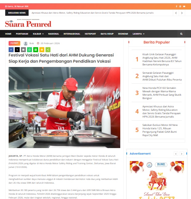 Festival Vokasi Satu Hati dari AHM Dukung Generasi Siap Kerja dan Pengembangan Pendidikan Vokasi by masmul 20 Februari 2026 in Silahkan kunjungi https://www.suarapemredkalbar.com/read/potret/20022026/festival-vokasi-satu-hati-dari-ahm-dukung-generasi-siap-kerja-dan-pengembangan-pendidikan-vokasi. You Might Like Regional Public Launching New ADV160 The SUV Pride Grand Launching New PCX 160 Truly Exceptional! Tetap hati-hati ya bro sist berkendara saat hujan.