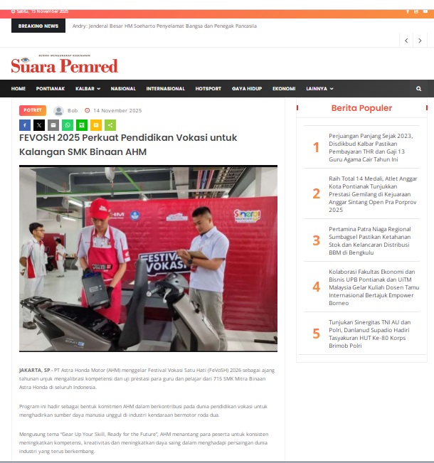 FEVOSH 2025 Perkuat Pendidikan Vokasi untuk Kalangan SMK Binaan AHM by masmul 14 November 2025 in Silahkan kunjungi https://www.suarapemredkalbar.com/read/potret/14112025/fevosh-2025-perkuat-pendidikan-vokasi-untuk-kalangan-smk-binaan-ahm. You Might Like Regional Public Launching New ADV160 The SUV Pride Grand Launching New PCX 160 Truly Exceptional! Tetap hati-hati ya bro sist berkendara saat hujan.