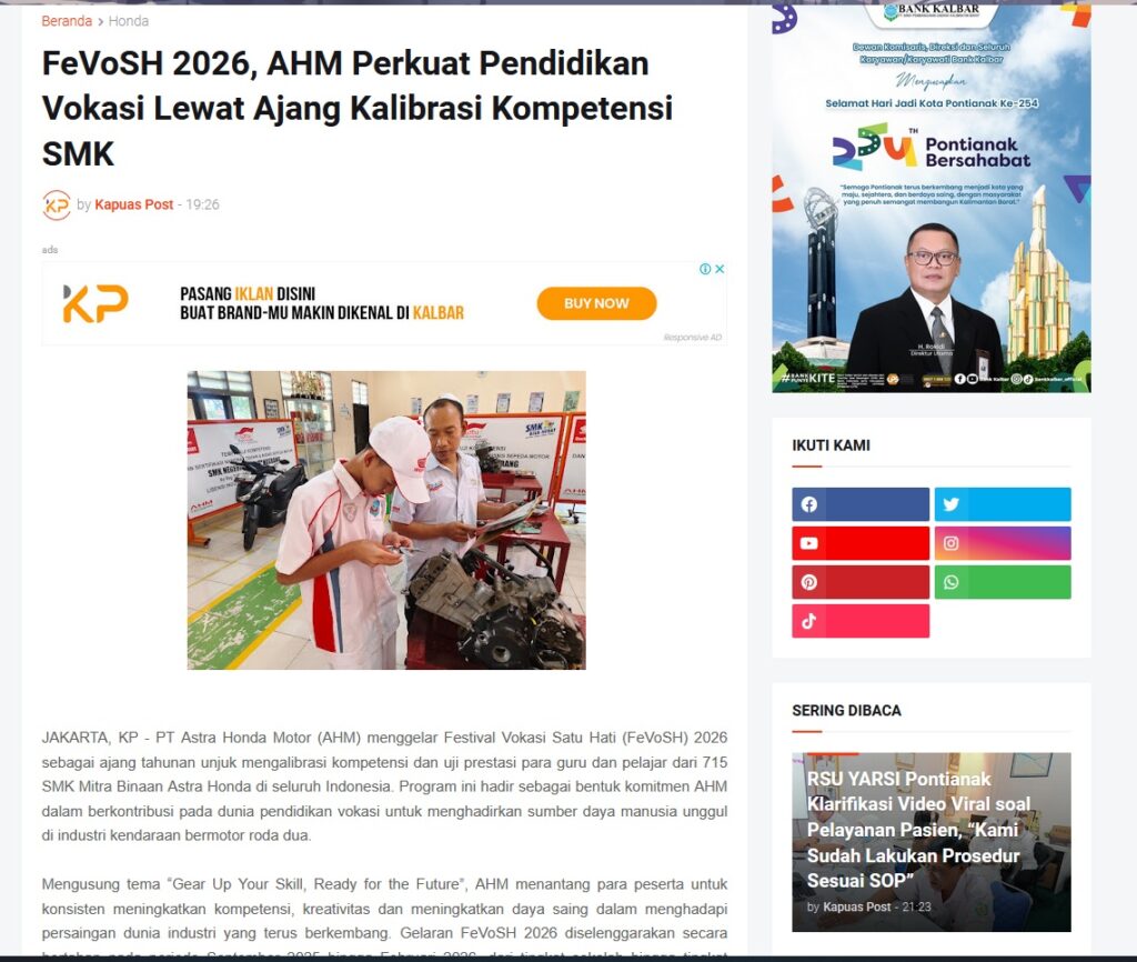 FeVoSH 2026, AHM Perkuat Pendidikan Vokasi Lewat Ajang Kalibrasi Kompetensi SMK by Muhammad Arif 13 November 2025 in Silahkan kunjungi https://www.kapuaspost.web.id/2025/11/fevosh-2026-ahm-perkuat-pendidikan.html. Tags: astra Astra Motor kalbar Astra Motor Pontianak astramotor honda kalbar pontianak sepeda motor You Might Like Regional Public Launching New ADV160 The SUV Pride Grand Launching New PCX 160 Truly Exceptional! Tetap hati-hati ya bro sist berkendara saat hujan.