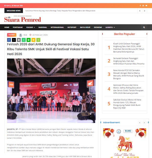 FeVosh 2026 dari AHM: Dukung Generasi Siap Kerja, 30 Ribu Talenta SMK Unjuk Skill di Festival Vokasi Satu Hati 2026 by masmul 22 Februari 2026 in Silahkan kunjungi https://www.suarapemredkalbar.com/read/potret/22022026/fevosh-2026-dari-ahm-dukung-generasi-siap-kerja-30-ribu-talenta-smk-unjuk-skill-di-festival-vokasi-satu-hati-2026. You Might Like Regional Public Launching New ADV160 The SUV Pride Grand Launching New PCX 160 Truly Exceptional! Tetap hati-hati ya bro sist berkendara saat hujan.