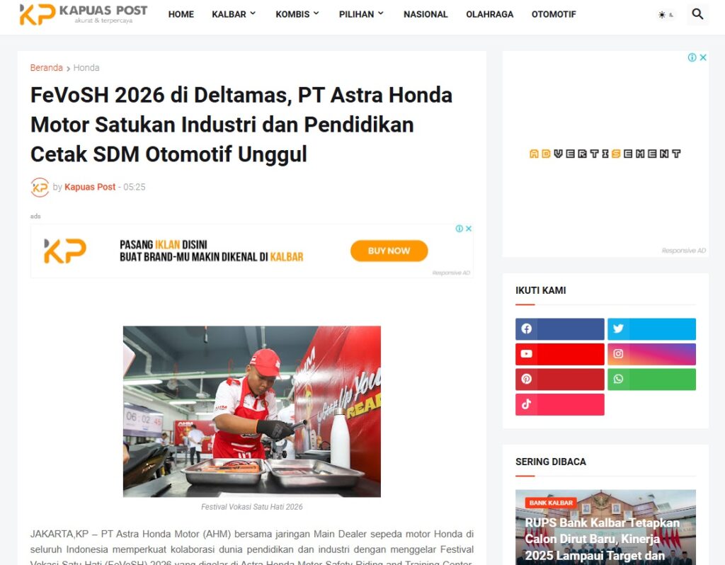 FeVoSH 2026 di Deltamas, PT Astra Honda Motor Satukan Industri dan Pendidikan Cetak SDM Otomotif Unggul by Muhammad Arif 26 Februari 2026 in Silahkan kunjungi https://www.kapuaspost.web.id/2026/02/fevosh-2026-di-deltamas-pt-astra-honda.html. Tags: astra Astra Motor kalbar Astra Motor Pontianak astramotor honda kalbar pontianak sepeda motor You Might Like Regional Public Launching New ADV160 The SUV Pride Grand Launching New PCX 160 Truly Exceptional! Tetap hati-hati ya bro sist berkendara saat hujan.