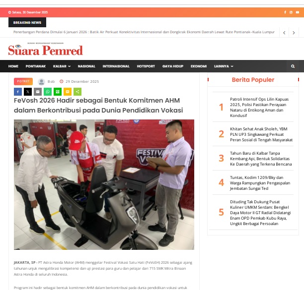 FeVosh 2026 Hadir sebagai Bentuk Komitmen AHM dalam Berkontribusi pada Dunia Pendidikan Vokasi by masmul 29 Desember 2025 in Silahkan kunjungi https://www.suarapemredkalbar.com/read/potret/29122025/fevosh-2026-hadir-sebagai-bentuk-komitmen-ahm-dalam-berkontribusi-pada-dunia-pendidikan-vokasi. You Might Like Regional Public Launching New ADV160 The SUV Pride Grand Launching New PCX 160 Truly Exceptional! Tetap hati-hati ya bro sist berkendara saat hujan.