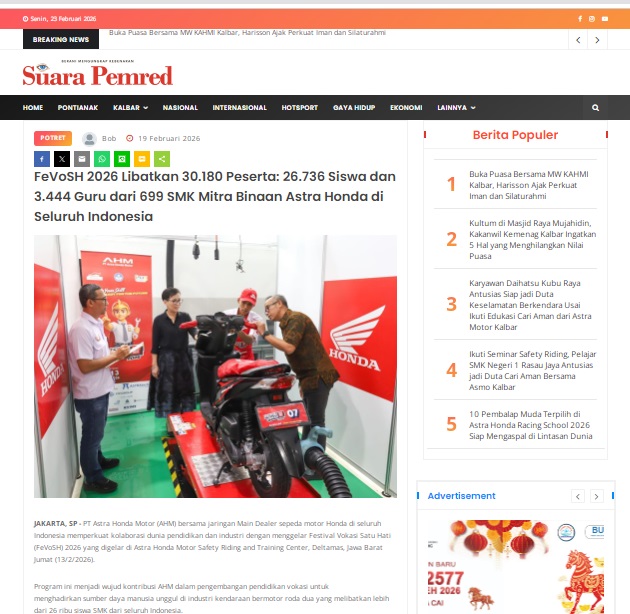 FeVoSH 2026 Libatkan 30.180 Peserta: 26.736 Siswa dan 3.444 Guru dari 699 SMK Mitra Binaan Astra Honda di Seluruh Indonesia by masmul 19 Februari 2026 in Silahkan kunjungi https://www.suarapemredkalbar.com/read/potret/19022026/fevosh-2026-libatkan-30180-peserta-26736-siswa-dan-3444-guru-dari-699-smk-mitra-binaan-astra-honda-di-seluruh-indonesia. You Might Like Regional Public Launching New ADV160 The SUV Pride Grand Launching New PCX 160 Truly Exceptional! Tetap hati-hati ya bro sist berkendara saat hujan.