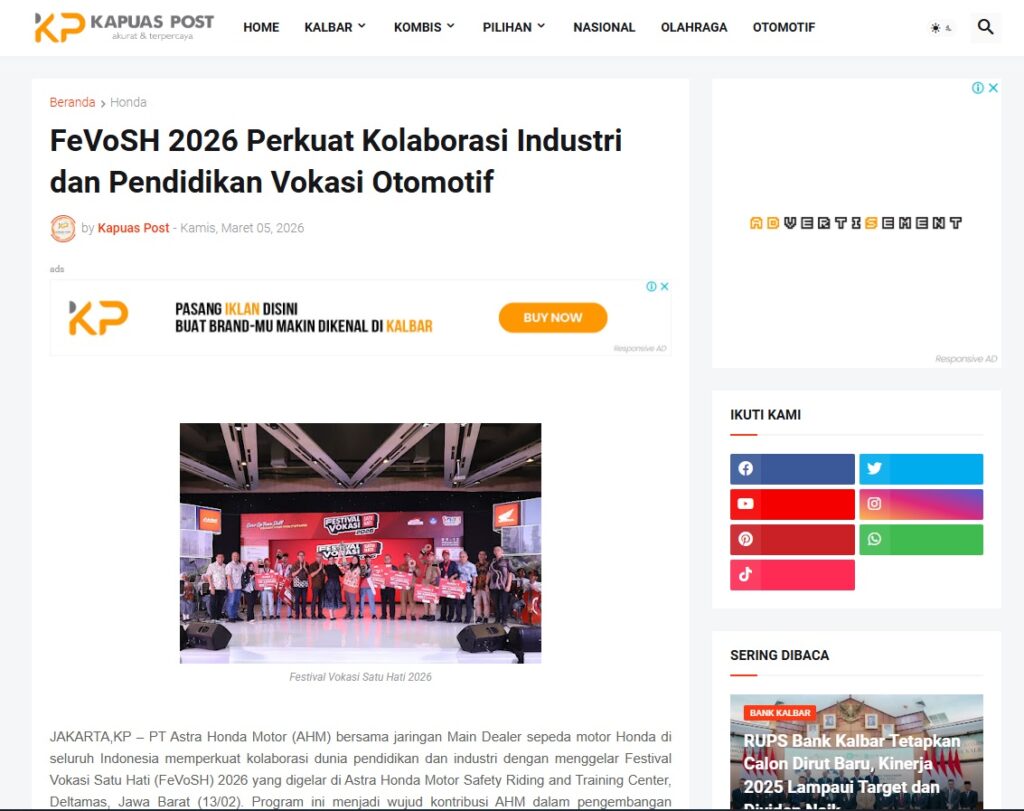 FeVoSH 2026 Perkuat Kolaborasi Industri dan Pendidikan Vokasi Otomotif by Muhammad Arif 5 Maret 2026 in Silahkan kunjungi https://www.kapuaspost.web.id/2026/03/fevosh-2026-perkuat-kolaborasi-industri_10.html. Tags: astra Astra Motor kalbar Astra Motor Pontianak astramotor honda kalbar pontianak sepeda motor You Might Like Regional Public Launching New ADV160 The SUV Pride Grand Launching New PCX 160 Truly Exceptional! Tetap hati-hati ya bro sist berkendara saat hujan.
