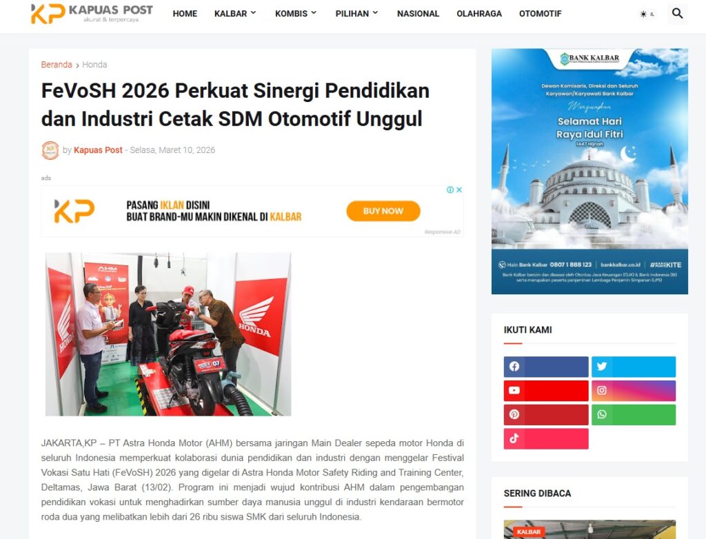 FeVoSH 2026 Perkuat Sinergi Pendidikan dan Industri Cetak SDM Otomotif Unggul by Muhammad Arif 10 Maret 2026 in Silahkan kunjungi https://www.kapuaspost.web.id/2026/03/fevosh-2026-perkuat-sinergi-pendidikan.html. Tags: astra Astra Motor kalbar Astra Motor Pontianak astramotor honda kalbar pontianak sepeda motor You Might Like Regional Public Launching New ADV160 The SUV Pride Grand Launching New PCX 160 Truly Exceptional! Tetap hati-hati ya bro sist berkendara saat hujan.