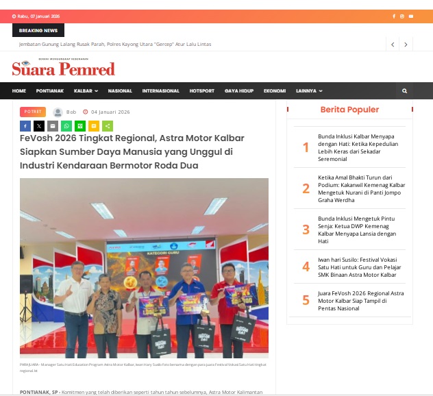 FeVosh 2026 Tingkat Regional, Astra Motor Kalbar Siapkan Sumber Daya Manusia yang Unggul di Industri Kendaraan Bermotor Roda Dua by masmul 4 Januari 2026 in Silahkan kunjungi https://www.suarapemredkalbar.com/read/potret/04012026/fevosh-2026-tingkat-regional-astra-motor-kalbar-siapkan-sumber-daya-manusia-yang-unggul-di-industri-kendaraan-bermotor-roda-dua. You Might Like Regional Public Launching New ADV160 The SUV Pride Grand Launching New PCX 160 Truly Exceptional! Tetap hati-hati ya bro sist berkendara saat hujan.