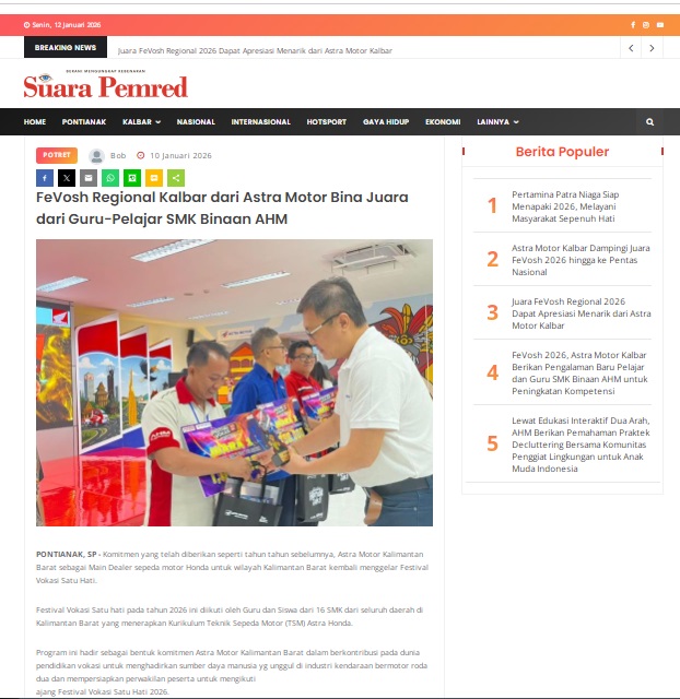 FeVosh Regional Kalbar dari Astra Motor Bina Juara dari Guru-Pelajar SMK Binaan AHM by masmul 10 Januari 2026 in Silahkan kunjungi https://www.suarapemredkalbar.com/read/potret/10012026/fevosh-regional-kalbar-dari-astra-motor-bina-juara-dari-guru-pelajar-smk-binaan-ahm. You Might Like Regional Public Launching New ADV160 The SUV Pride Grand Launching New PCX 160 Truly Exceptional! Tetap hati-hati ya bro sist berkendara saat hujan.