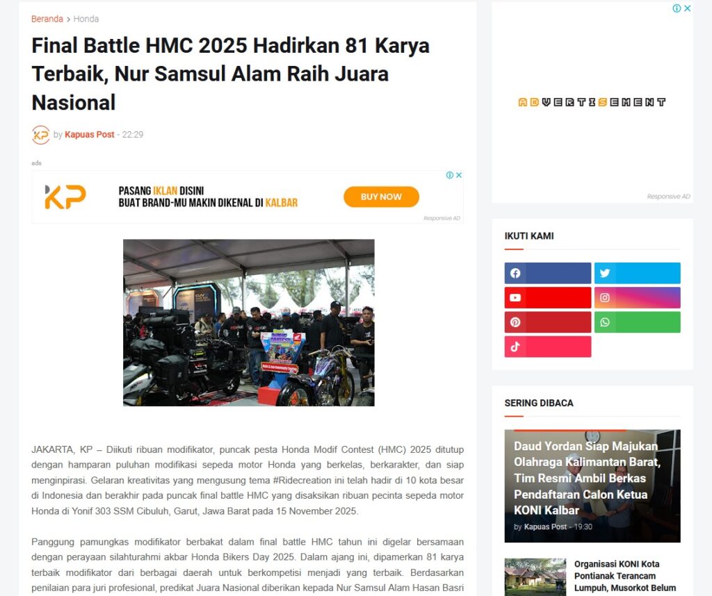 Final Battle HMC 2025 Hadirkan 81 Karya Terbaik, Nur Samsul Alam Raih Juara Nasional by Muhammad Arif 19 November 2025 in Silahkan kunjungi https://www.kapuaspost.web.id/2025/11/final-battle-hmc-2025-hadirkan-81-karya.html. Tags: astra Astra Motor kalbar Astra Motor Pontianak astramotor honda kalbar pontianak sepeda motor You Might Like Regional Public Launching New ADV160 The SUV Pride Grand Launching New PCX 160 Truly Exceptional! Tetap hati-hati ya bro sist berkendara saat hujan.