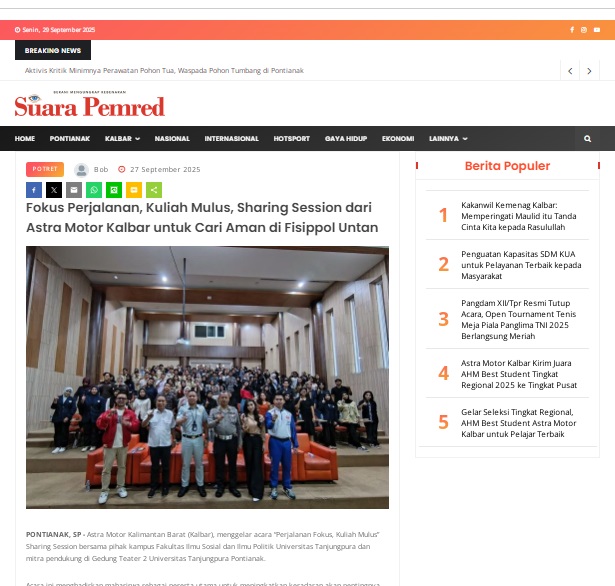 Fokus Perjalanan, Kuliah Mulus, Sharing Session dari Astra Motor Kalbar untuk Cari Aman di Fisippol Untan by masmul 27 September 2025 in Silahkan kunjungi https://www.suarapemredkalbar.com/read/potret/27092025/fokus-perjalanan-kuliah-mulus-sharing-session-dari-astra-motor-kalbar-untuk-cari-aman-di-fisippol-untan. You Might Like Regional Public Launching New ADV160 The SUV Pride Grand Launching New PCX 160 Truly Exceptional! Tetap hati-hati ya bro sist berkendara saat hujan.