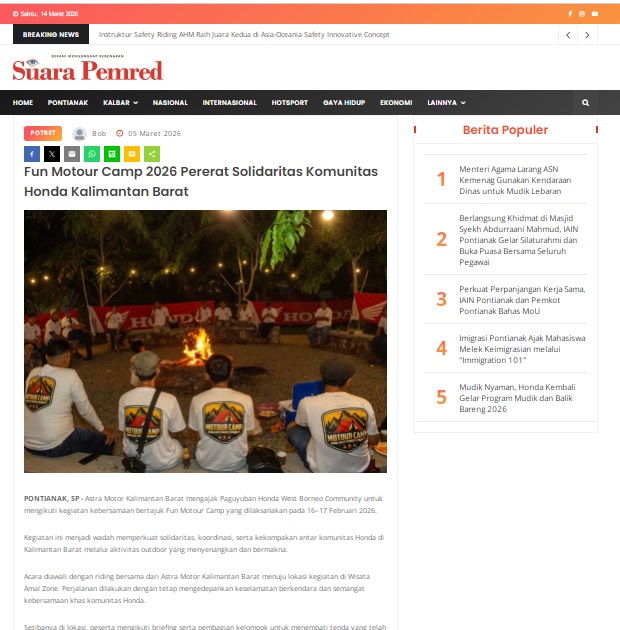 Fun Motour Camp 2026 Pererat Solidaritas Komunitas Honda Kalimantan Barat by masmul 5 Maret 2026 in Silahkan kunjungi https://www.suarapemredkalbar.com/read/potret/05032026/fun-motour-camp-2026-pererat-solidaritas-komunitas-honda-kalimantan-barat. You Might Like Regional Public Launching New ADV160 The SUV Pride Grand Launching New PCX 160 Truly Exceptional! Tetap hati-hati ya bro sist berkendara saat hujan.